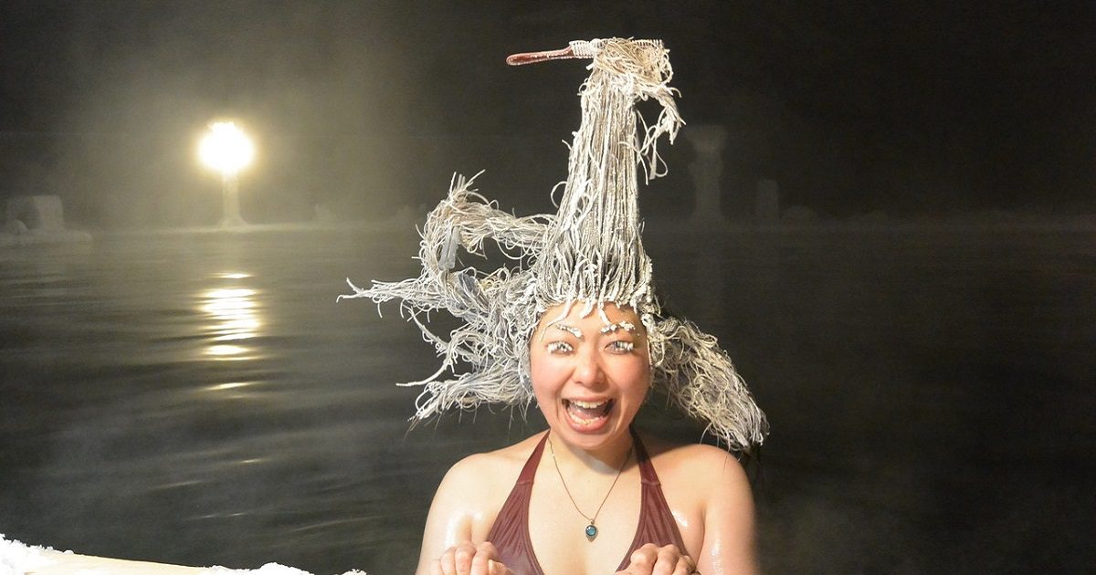 Dip your head in the hot springs and wet your hair completely. For best results, the outside temperature should be below -20°C. Don’t worry – freezing your hair won’t damage it.