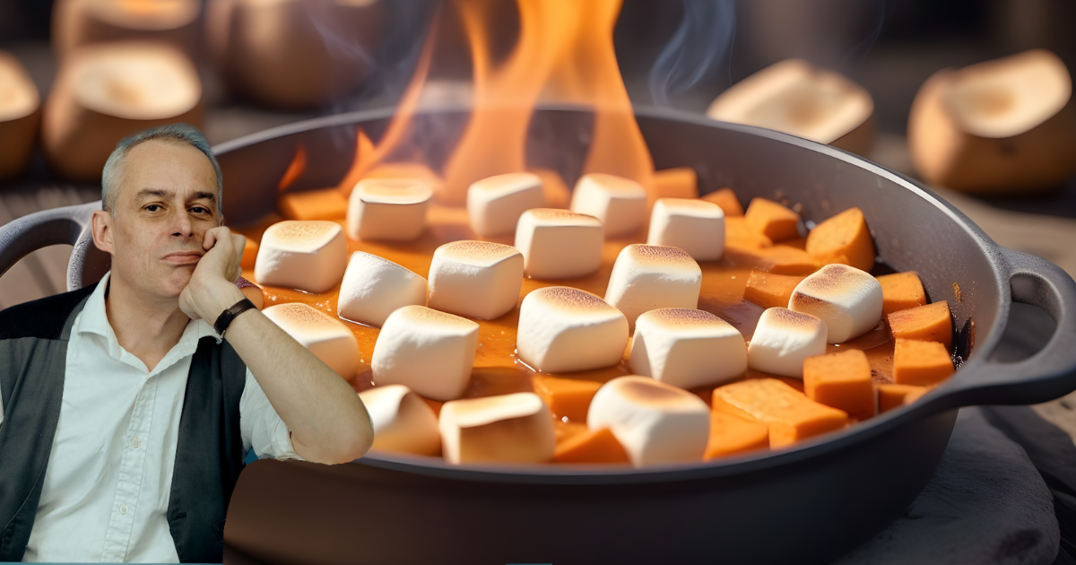 But in my mother’s household, the tradition persists. Aged eighty-something, she became a little too frail, so I took over the cooking duties. I shall be doing it this year. I am not looking forward to the turkey, and only a little bit towards the pumpkin pie (which my mother will be making, I don’t have a clue). But there will definitely not be sweet potatoes. Or, for crying out loud, marshmallows.