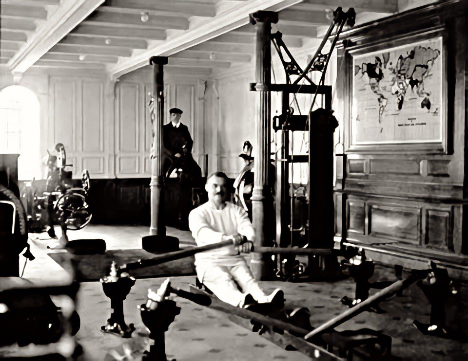 Titanic gym on 11 April 1912. Instructor McCawley demonstrates the rowing machine. William Parr tests a piece of the equipment